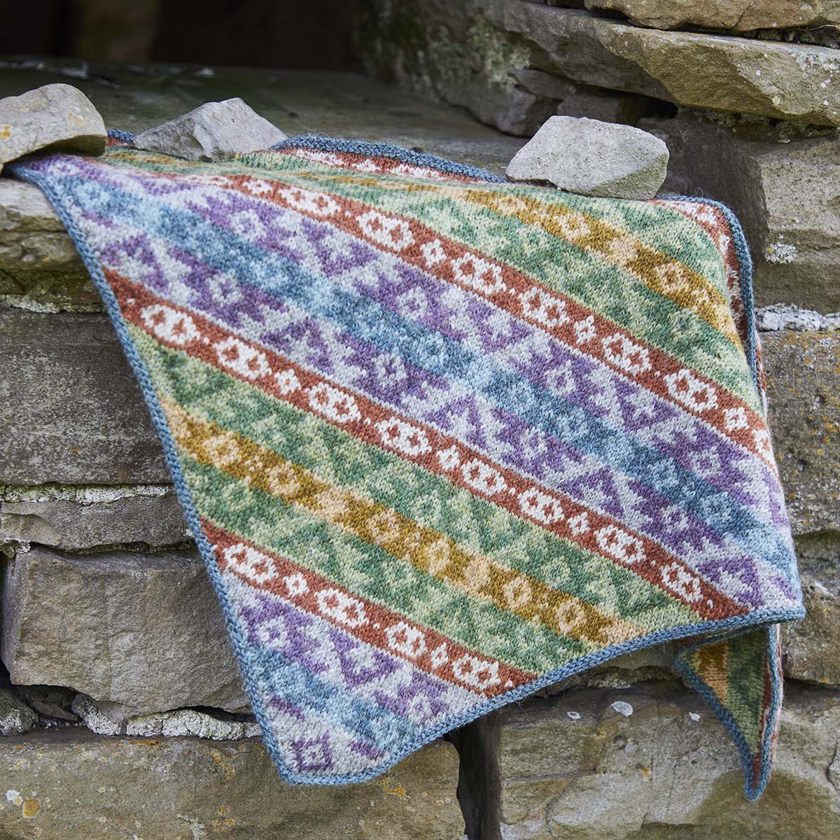 The Kilim Neckerchief was the fun project from my October 2025 weekend workshop at Farfield Mill. The neckerchief is knitted flat, using 10 colours of British Breeds yarn.