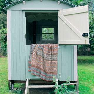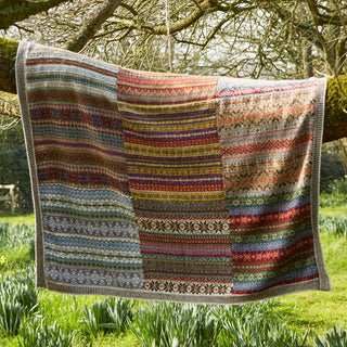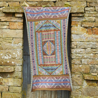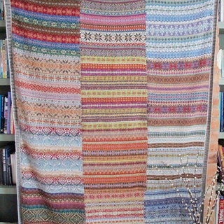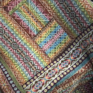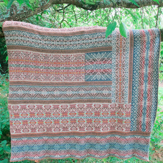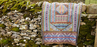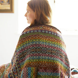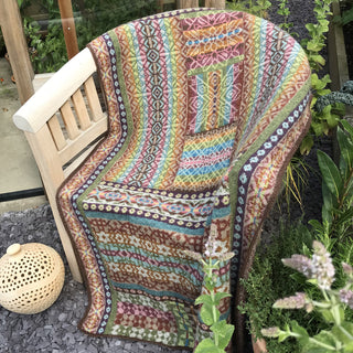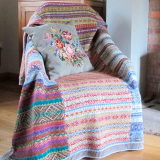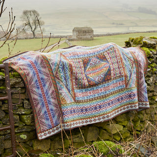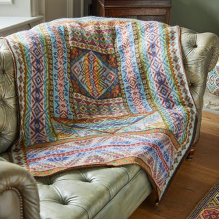 The Kilim Throw is a beautiful design inspired by motifs found in antique Persian carpets, antique kilims and carpets from Anatolia. It is knitted in 9 sections, using 22 colours of British Breeds yarn and uses several different knitting techniques - knitting Fairisle flat, picking up stitches, increasing and decreasing stitches. The triangular sections in the Kilim Throw help make the design look like a real kilim carpet!