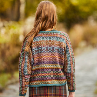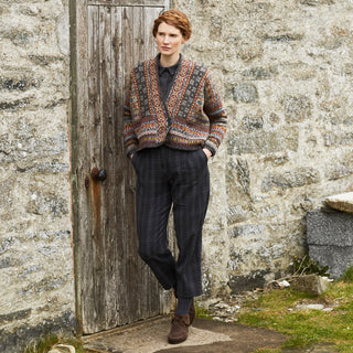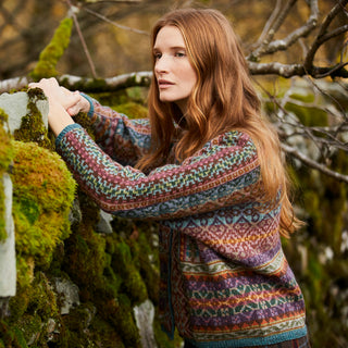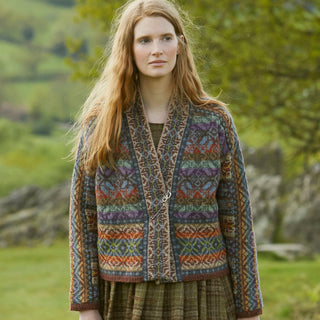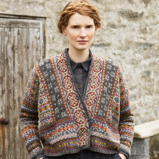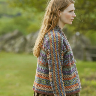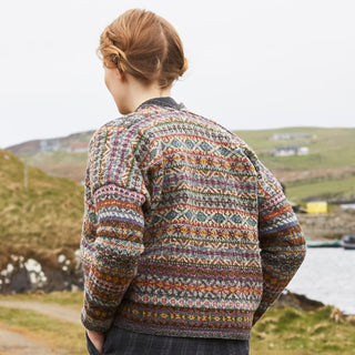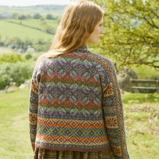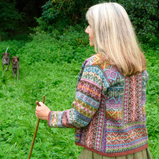 Tapestry Wrap is a beautiful cardigan wrap with a slight Japanese influence. It is knitted in 7 sections using 20 colours of the British Breeds yarn and uses several different knitting techniques, including knitting Fairisle in the round, knitting Fairisle flat, steeking, short row shaping, picking up stitches, 3 needle cast off, grafting and mattress stitch. Fairisle Club 6 is exclusive to Fairisle Club members and is available to buy as a yarn kit or digital version. For more information, please email.